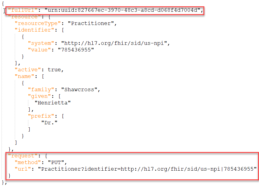 When the FHIR server actions the PUT request, it first runs the query to see if a Practitioner exists with an identifier of system “http://hl7.org/fhir/sid/us-npi” and value “785436955”.